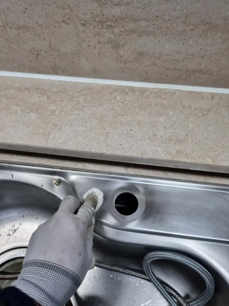 기존 수전을 완전히 제거한 후 싱크대 구멍 주변을 깨끗하게 청소했습니다. 오래된 실리콘과 이물질을 완전히 제거해야 새 수전이 제대로 밀착됩니다. 이 과정이 마무리의 깔끔함을 좌우하기 때문에 꼼꼼하게 진행했습니다.