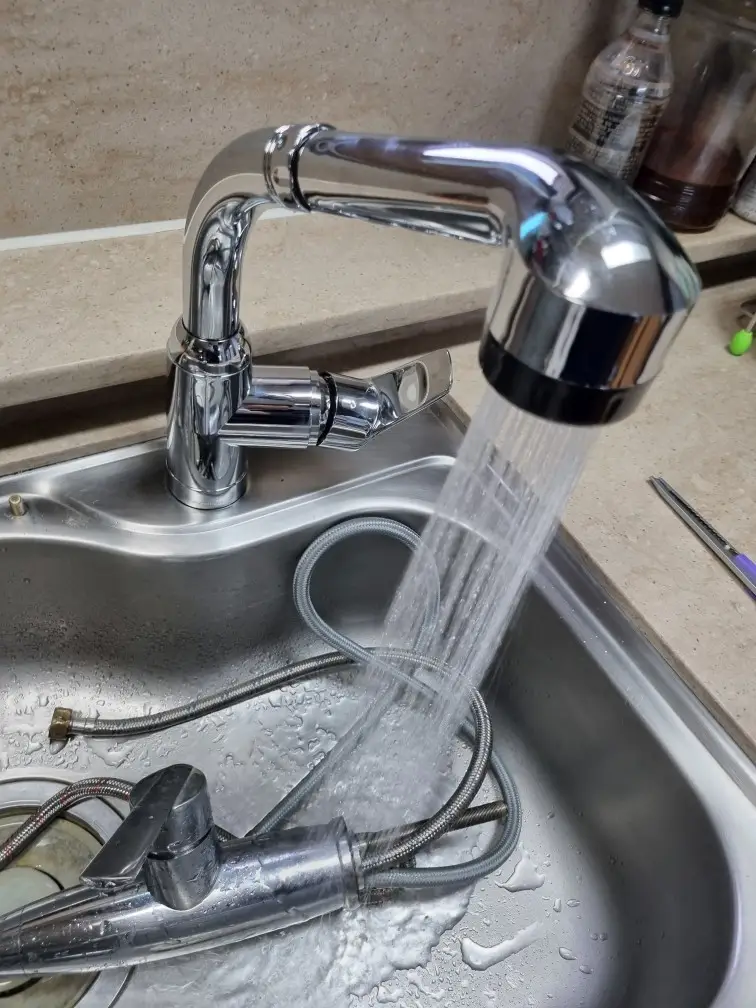 모든 설치가 끝나면 수전이 정상적으로 작동하는지 테스트했습니다. 수전을 틀어보며 누수가 없는지 꼼꼼하게 확인했습니다. 수전 하부, 호스 연결부, 고정 너트 주변 등 모든 부분을 체크했습니다.